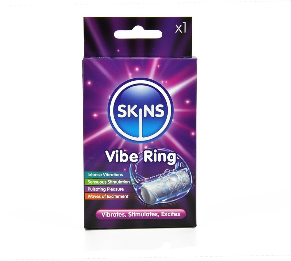 Skins Vibe ring retail pack with a handy loop on the top to be hung on shelves. Enjoy good vibrations & sensuous stimulation with this super stretchy ring powerfully motored for enhanced vibration. Batteries included